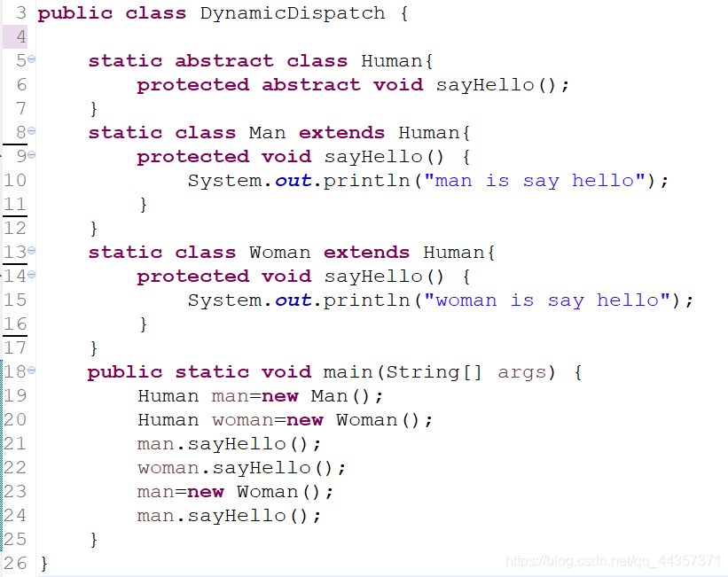 首先引入两个概念:我们把代码中的Human成为变量的静态类型,把Man、Woman称为变量的实际类型。
