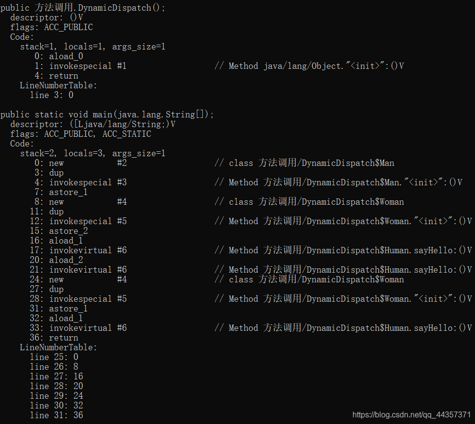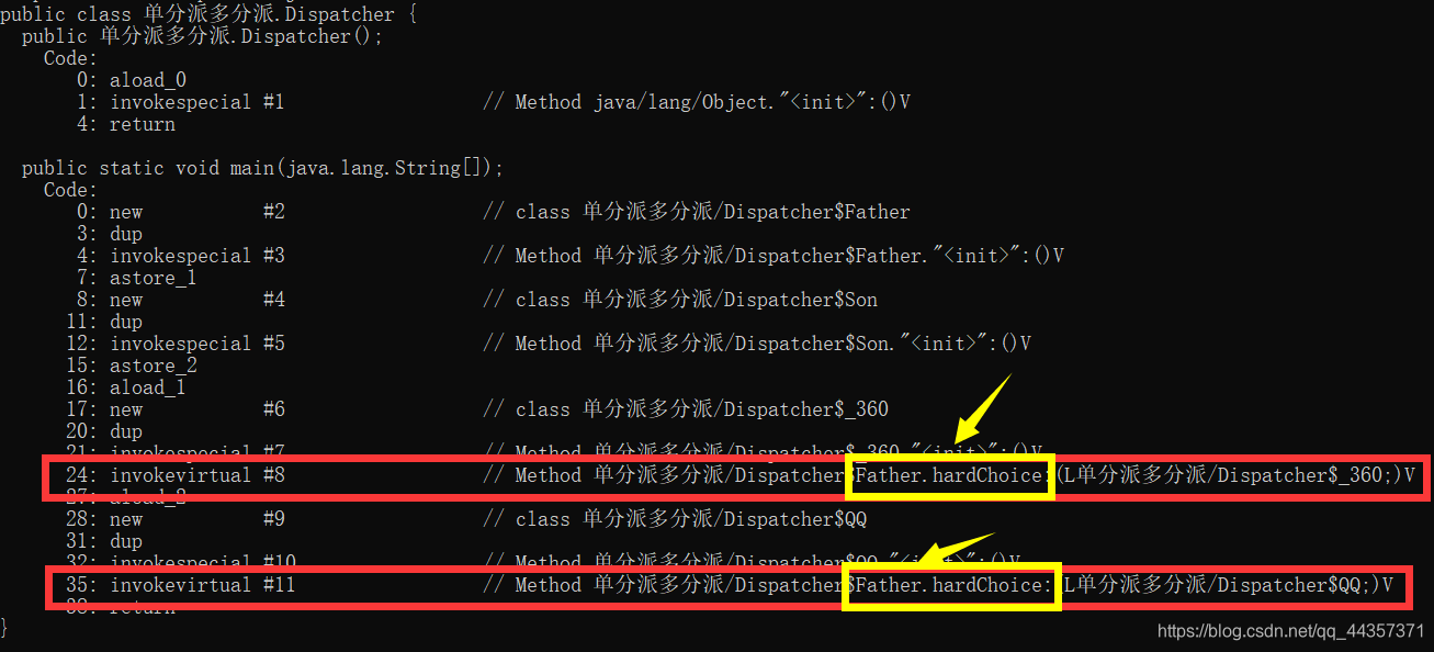 35: invokevirtual #11 // Method 单分派多分派/Dispatcher$Father.hardChoice:(L单分派多分派/Dispatcher$QQ;)V对应的是代码的: