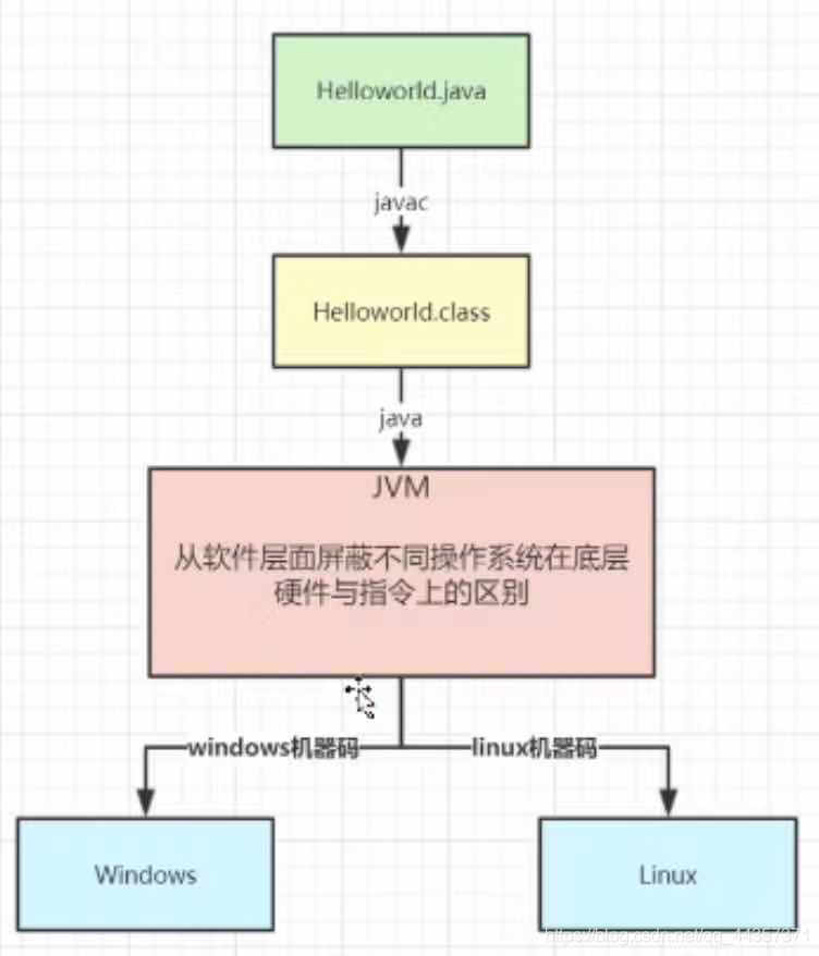 首先看这张图片,我们写的Java代码,通过Javac编译成字节码文件,然后通过Java命令进入jvm。但是在不同的平台上机器码不一样,所以jvm一个宏观上的理解就是:从软件层面屏蔽不同操作系统在底层硬件与指令上的区别。