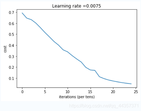 1 | parameters = L_layer_model(train_x, train_y, layers_dims, learning_rate=0.0075, num_iterations=3000, print_cost=True) |