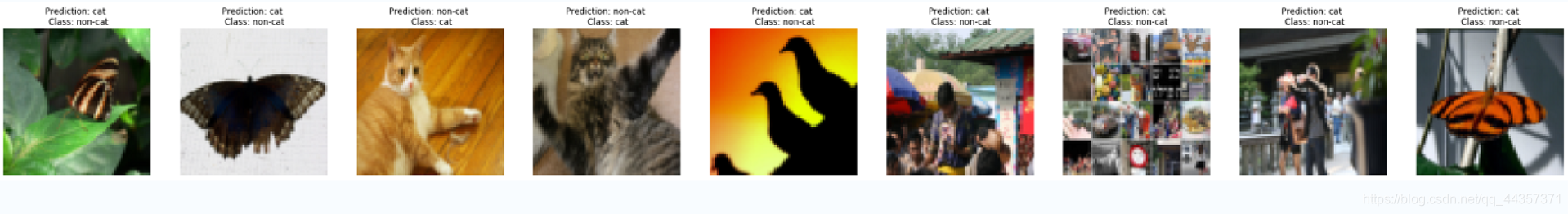 Accuracy: 0.82000000000000011 | print_mislabeled_images(classes, test_x, test_y, predict_test) |