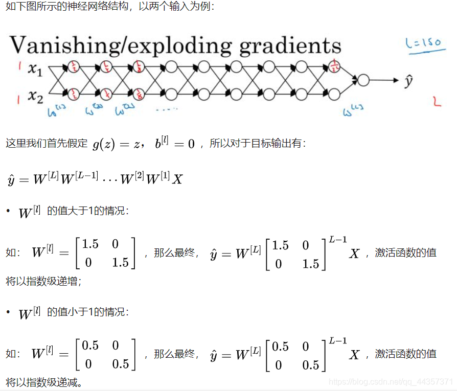 上面的情况对于导数也是同样的道理,所以在计算梯度时,根据情况的不同,梯度函数会以指数级递增或者递减,导致训练导数难度上升,梯度下降算法的步长会变得非常非常小,需要训练的时间将会非常长。